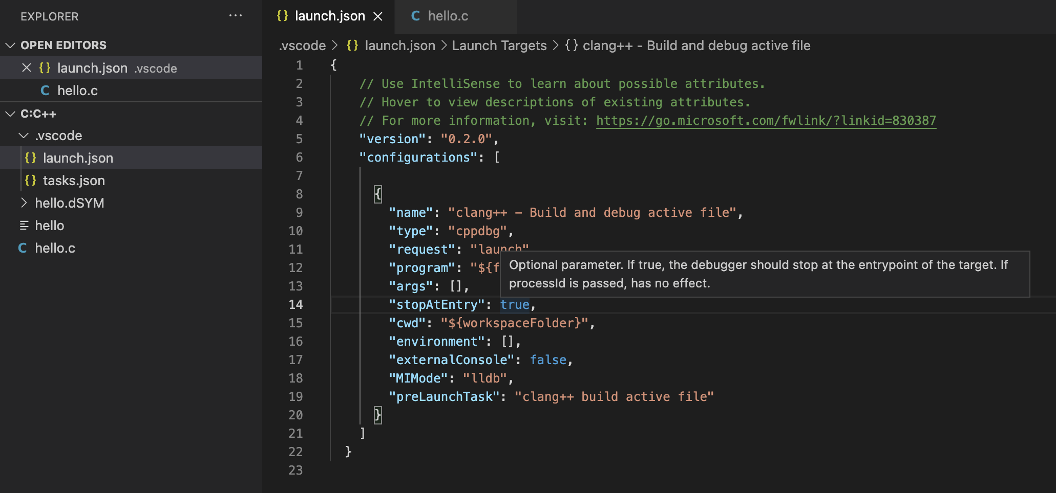 디버깅을 하기 위해서 아까 언급했던 lldb를 이용해야한다. .vscode 폴더에 launch.json을 아래와 같이 생성하거나 디버깅을 실행하면 launch.json파일이 자동으로 생성된다.