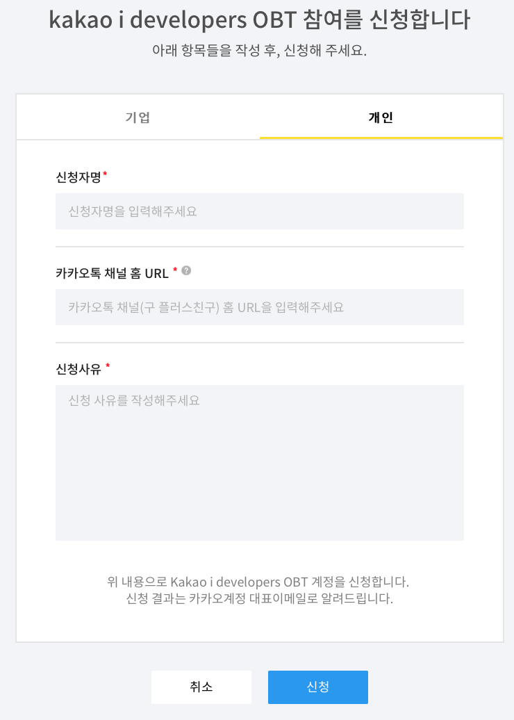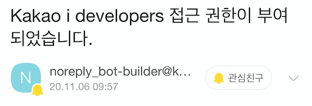채널을 만들었다면 카카오 I 오픈빌더(Kakao I Open Builder)로 가서 개발 계정 신청을 합니다.