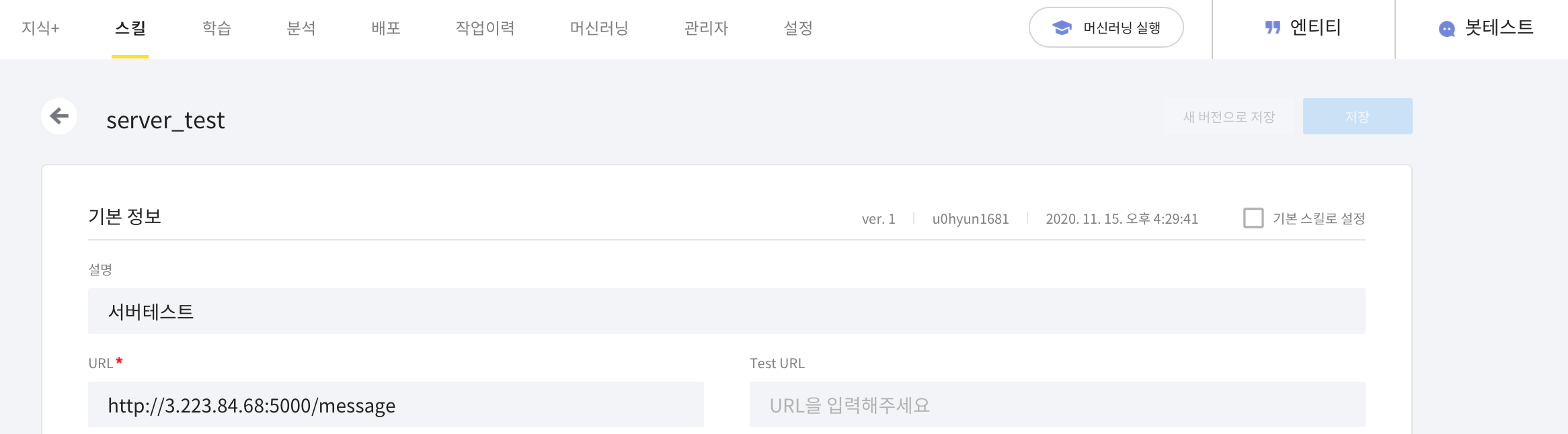 패턴 발화를 입력했다면 호출할 api url을 입력하여 스킬에 등록해줍니다.