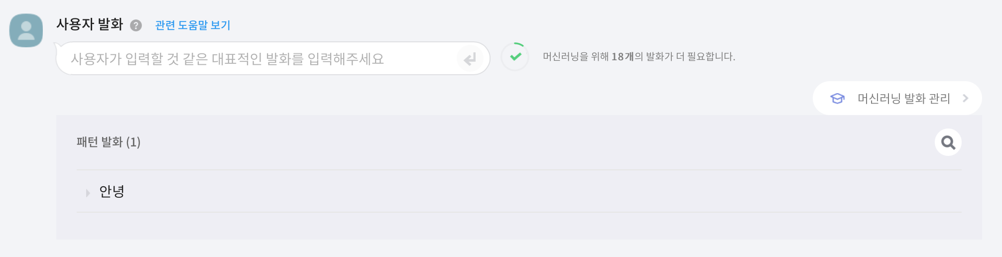 해당 블록이 안녕이라는 발화를 입력받았을 때 실행될 수 있도록 패턴 발화를 입력해줍니다.